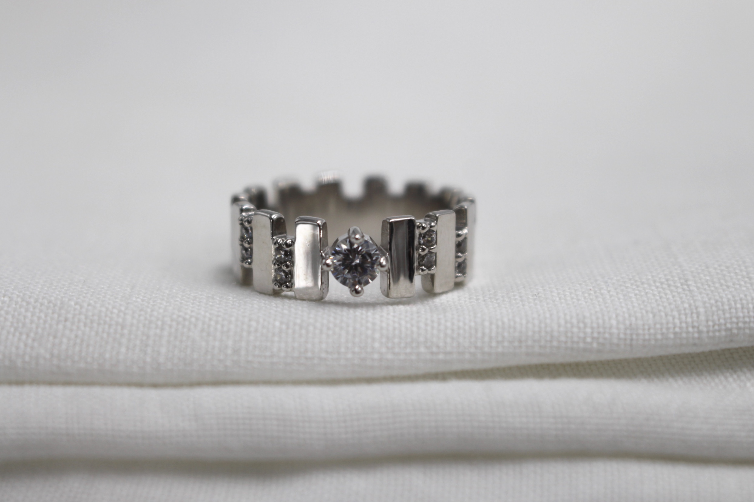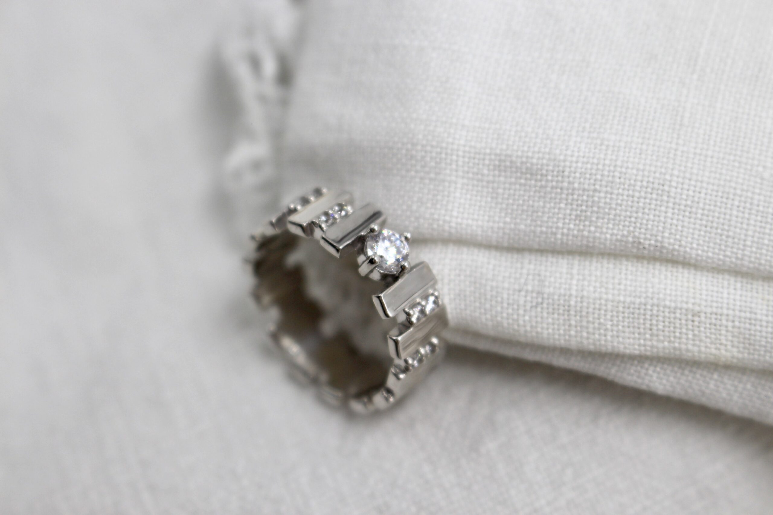 Bague en argent rhodié. Ornée de pierres de zirconium.